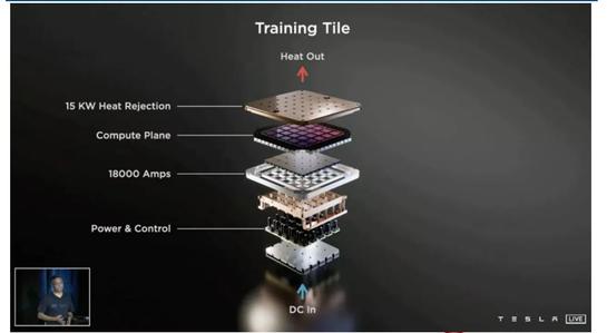 特斯拉自研了服务于自动驾驶的超级计机—Dojo,以及自研的AI训练芯片D1。作为Dojo架构的重要组成部分,D1芯片采用7纳米制造工艺,处理能力为每秒1024亿次。由于每个D1芯片之间都是无缝连接在一起,相邻芯片之间的延迟极低,训练模块最大程度上实现了带宽的保留,配合特斯拉自创的高带宽、低延迟的连接器,算力高达9PFLOPs(9000万亿次)。